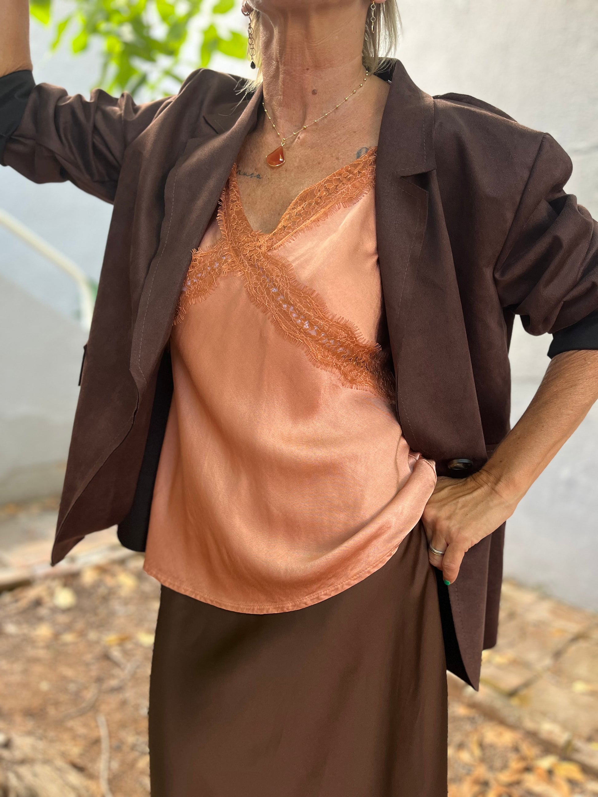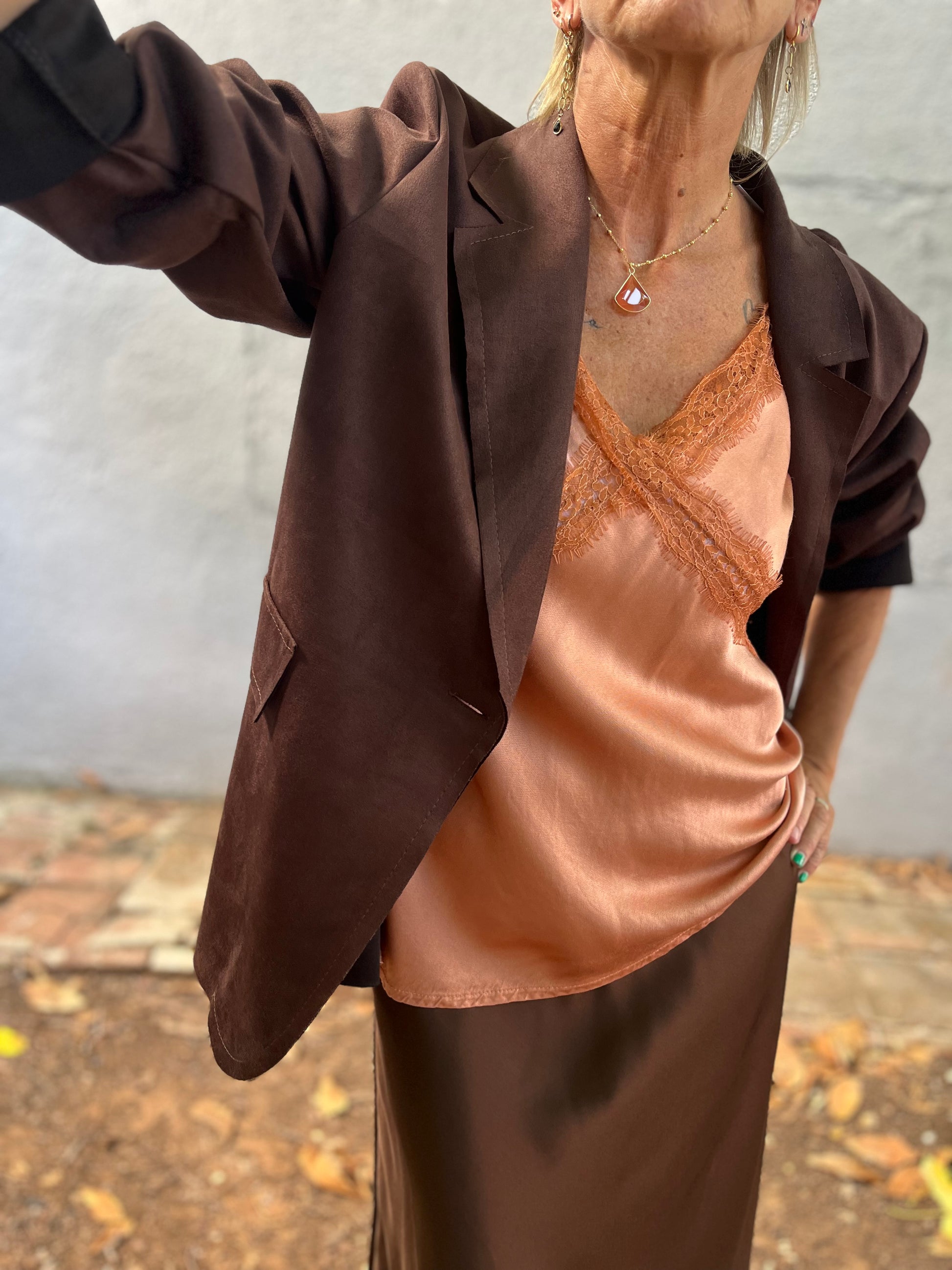 Americana oversize, de ante sintetico, desetructurada, sin hombreras, cuello solapa y botón delantero para poder abrochar