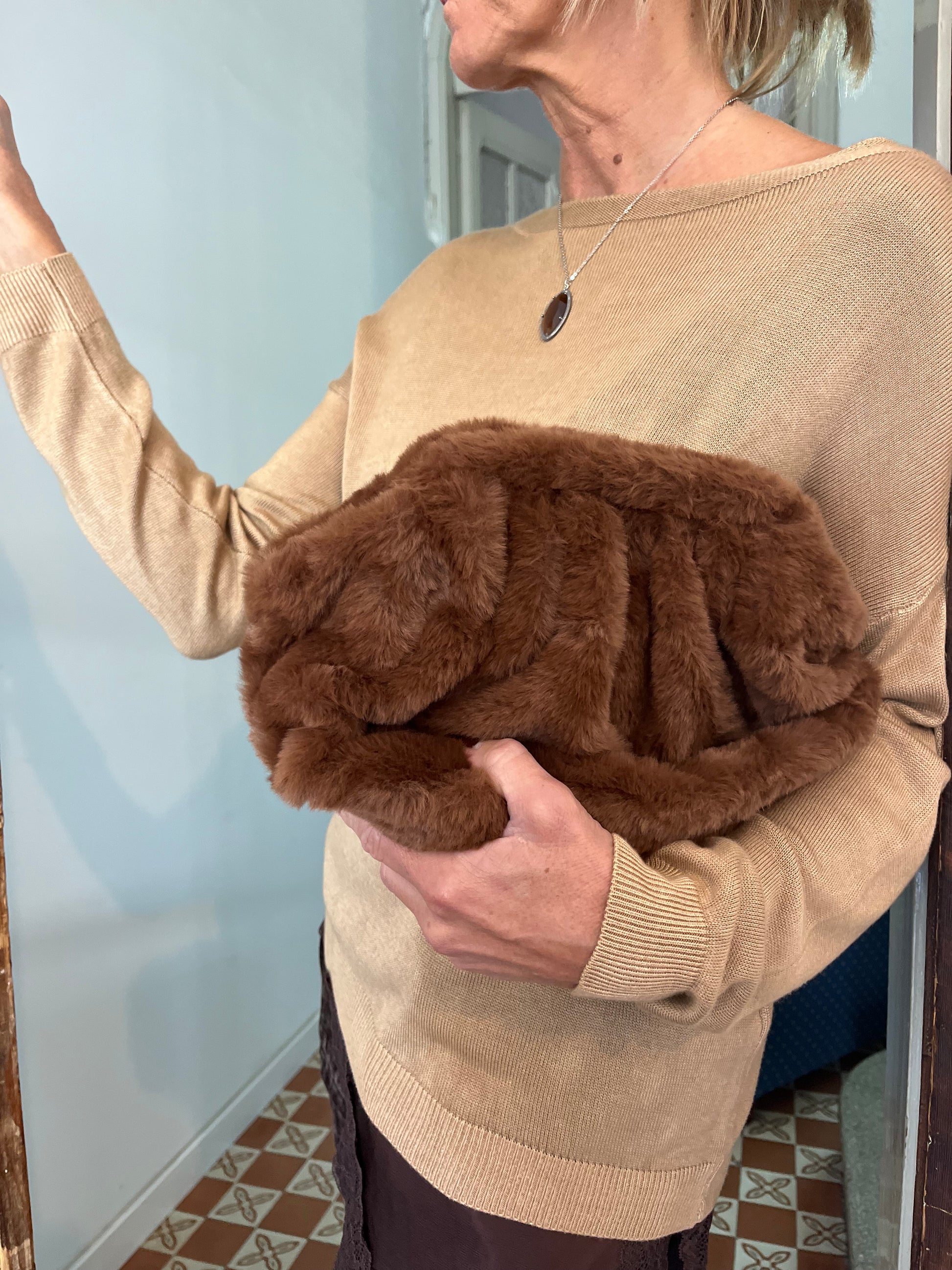 Bolso de mano, clunch y con opción de cadena dorada. De 30 cm de largo y 10cm de base.... cierre a presión