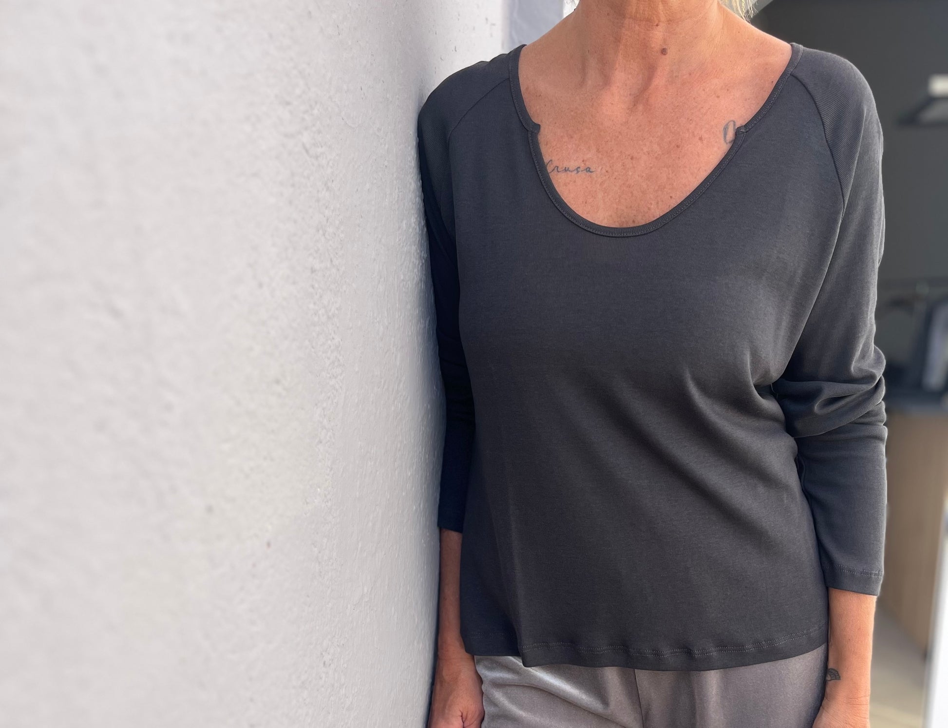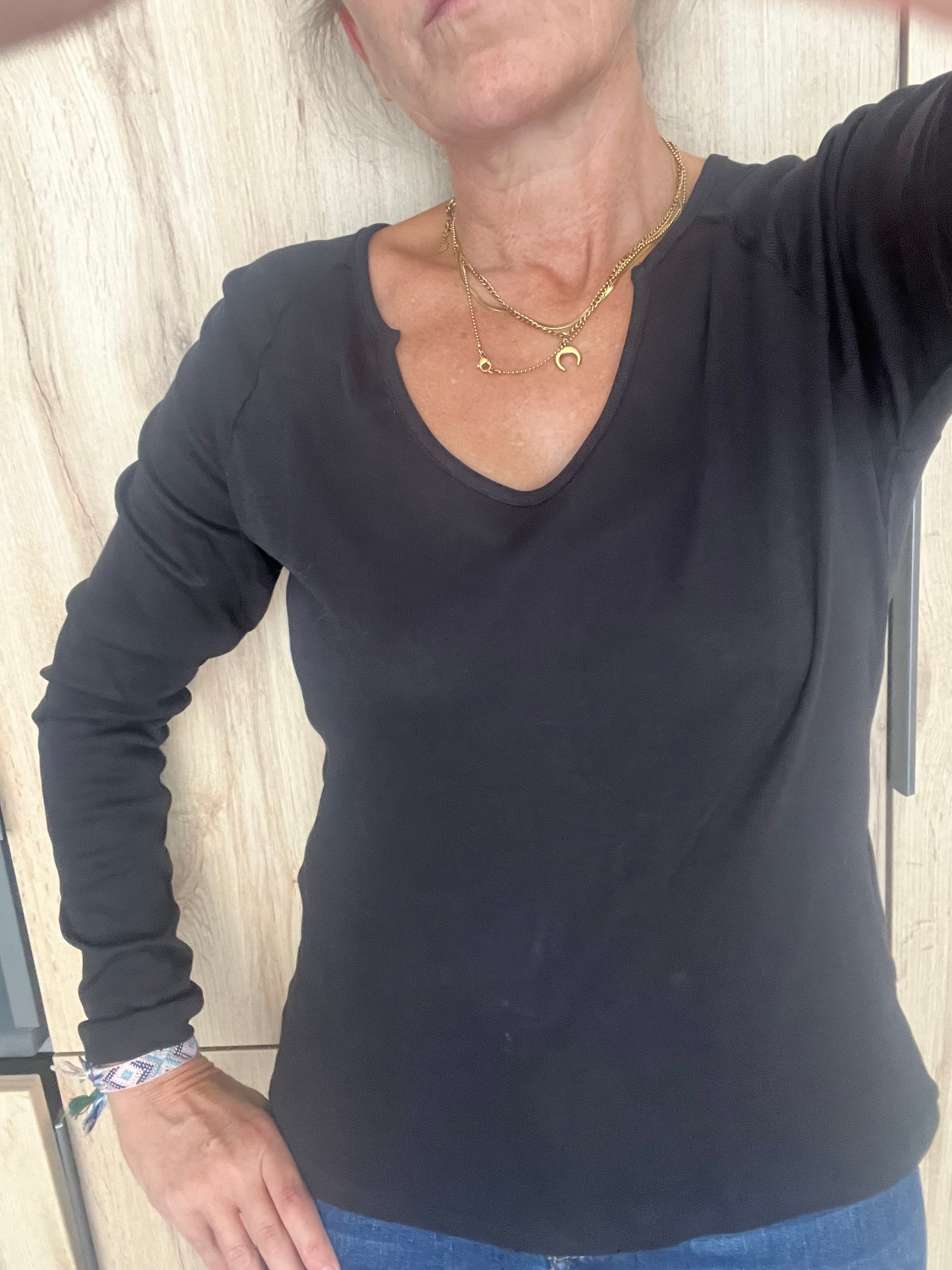 Camiseta cuello redondo en pico y manga larga, estrecha sin ser ajustada, largita por debajo de cintura