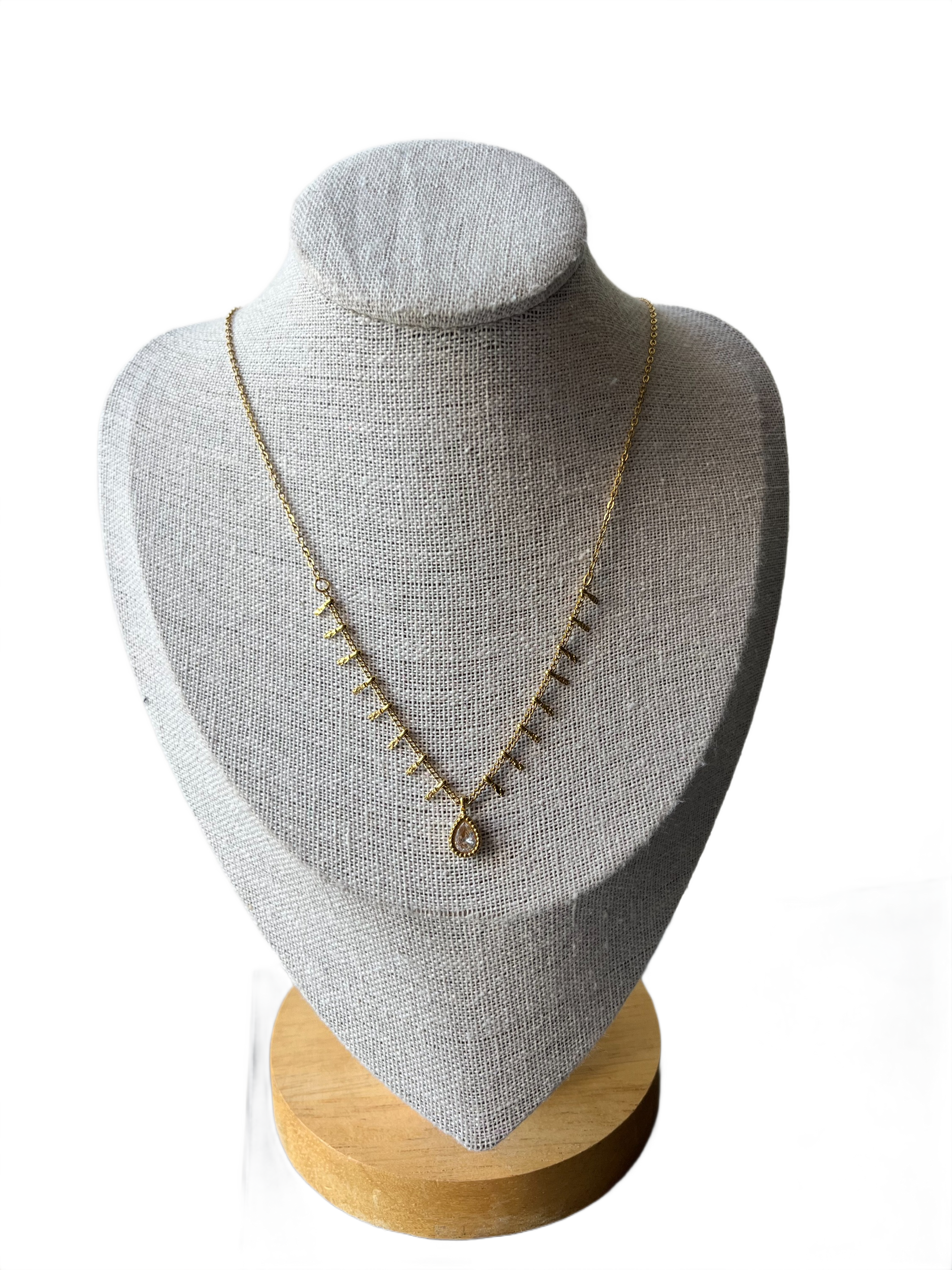 Collar de cadena muy fina, con detalles congalntes a media cadena... colgante con piedra brillante en forma de lágrima. 40cm de largo y 2cm de cadenita para ajustar medida