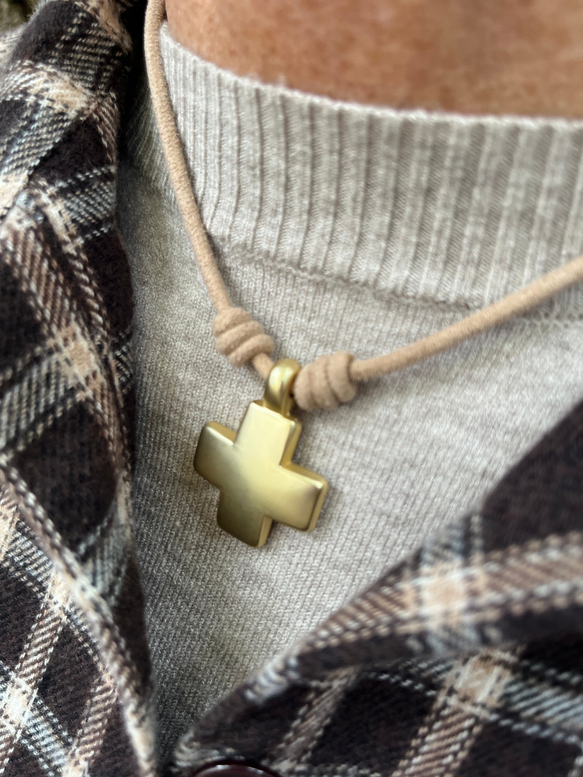 Collar de antelina redonda y cruz cuadrada en dorado mate..... 40cm de largo y 3cm de cadenita par adaptar medida