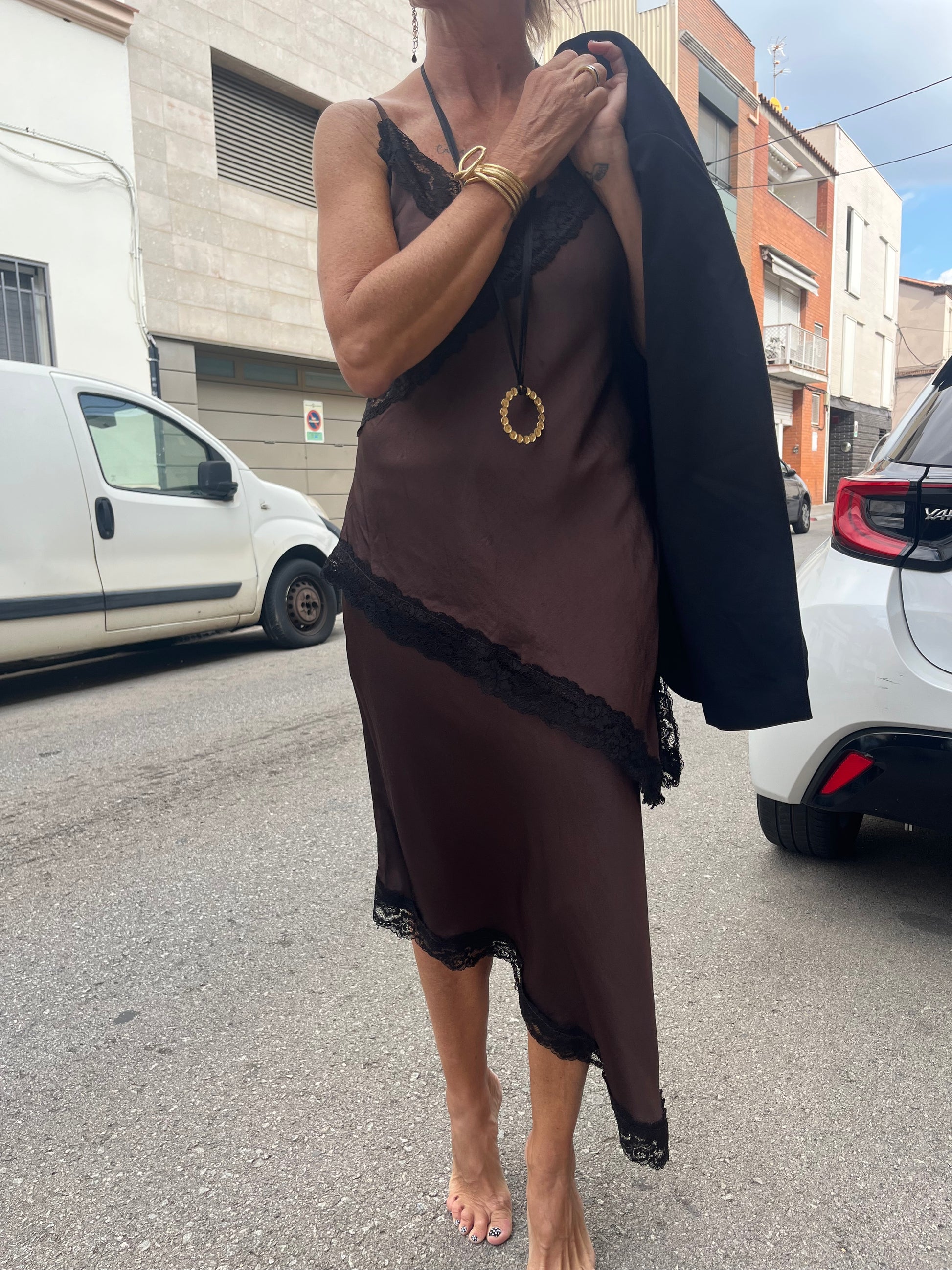 Falda satén asimétrica con encaje negro de contraste y goma en cintura