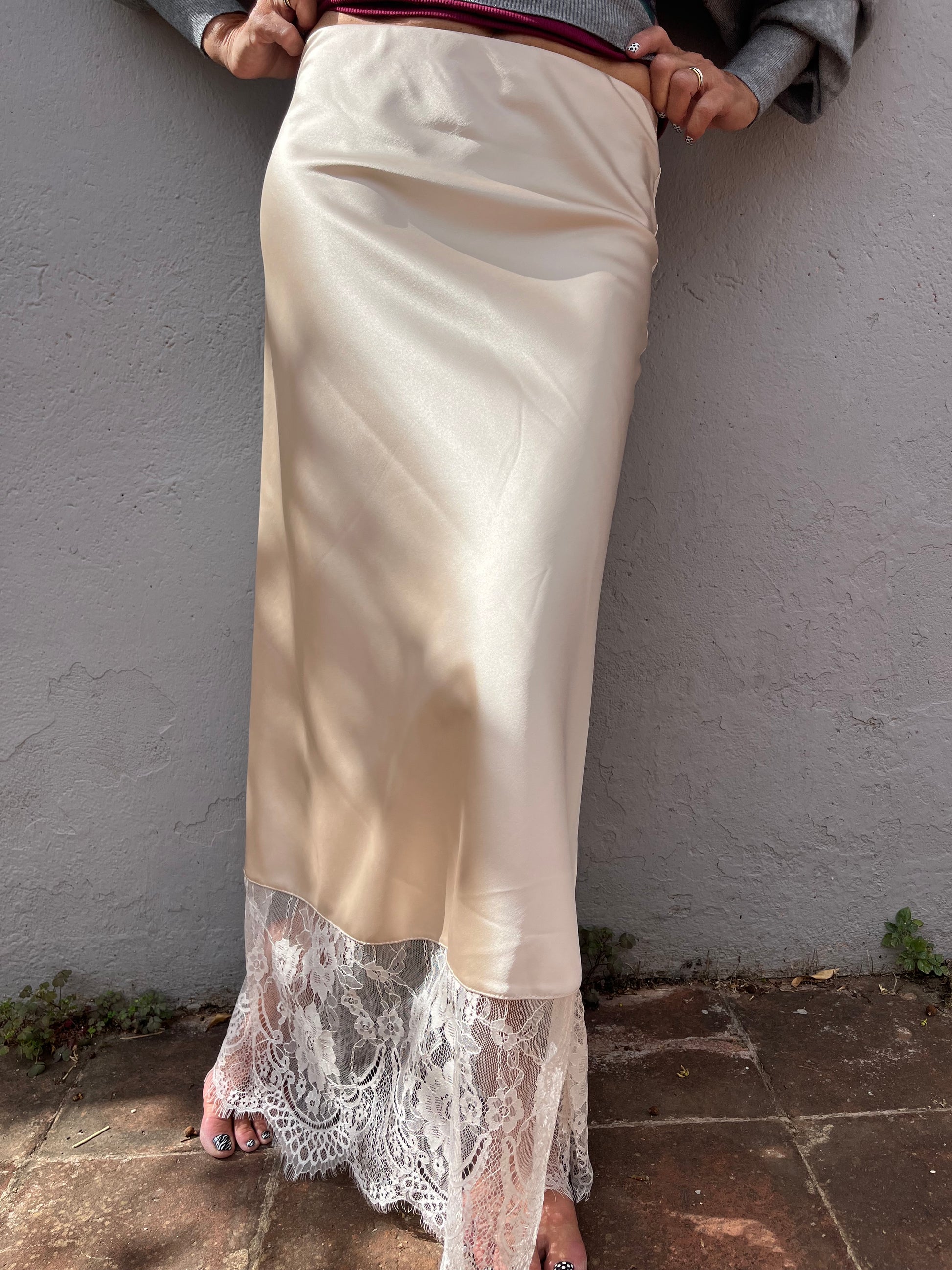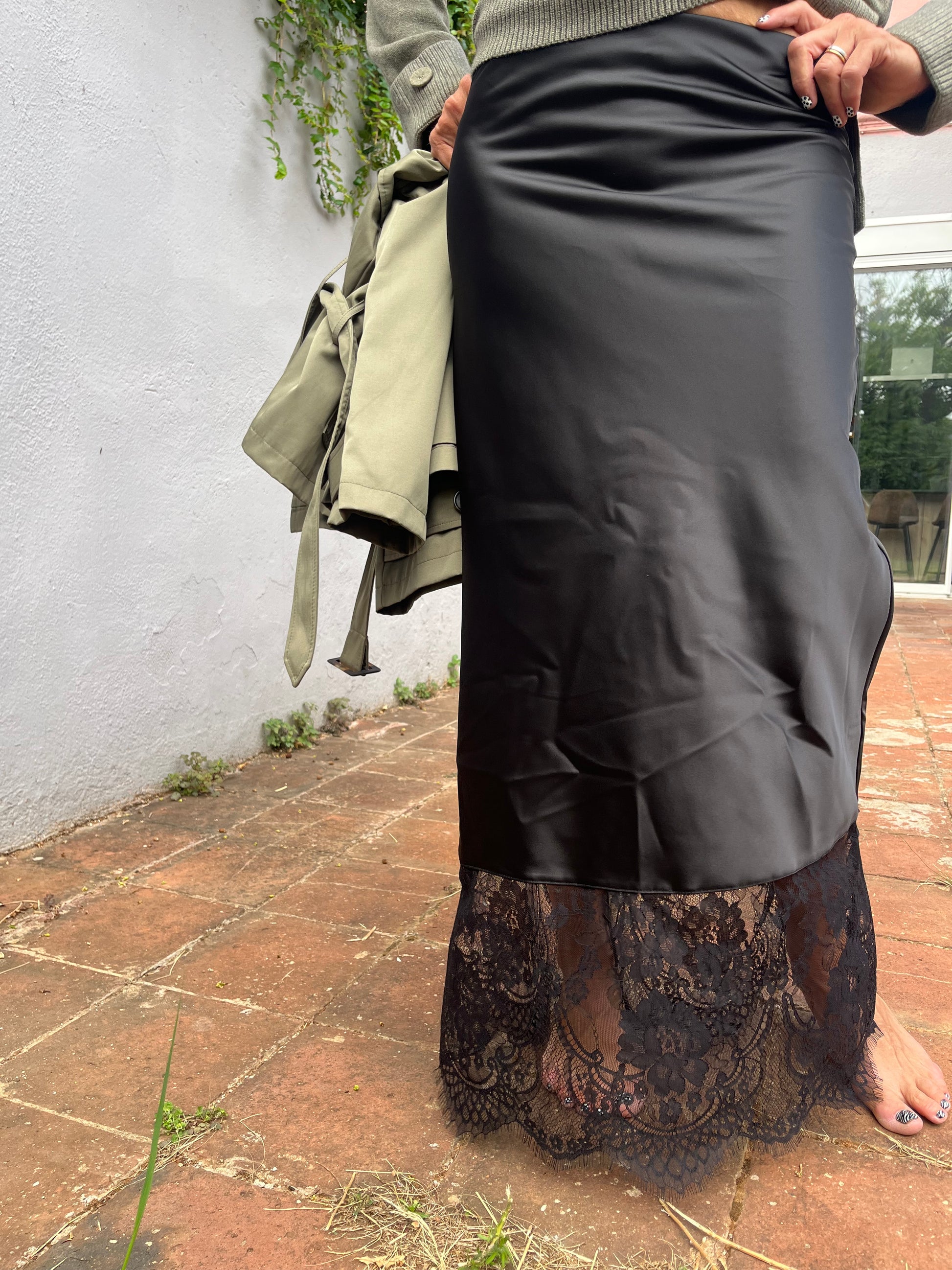 Falda satén recta con goma en la cintura y encaje de 5 cm en la parte inferior