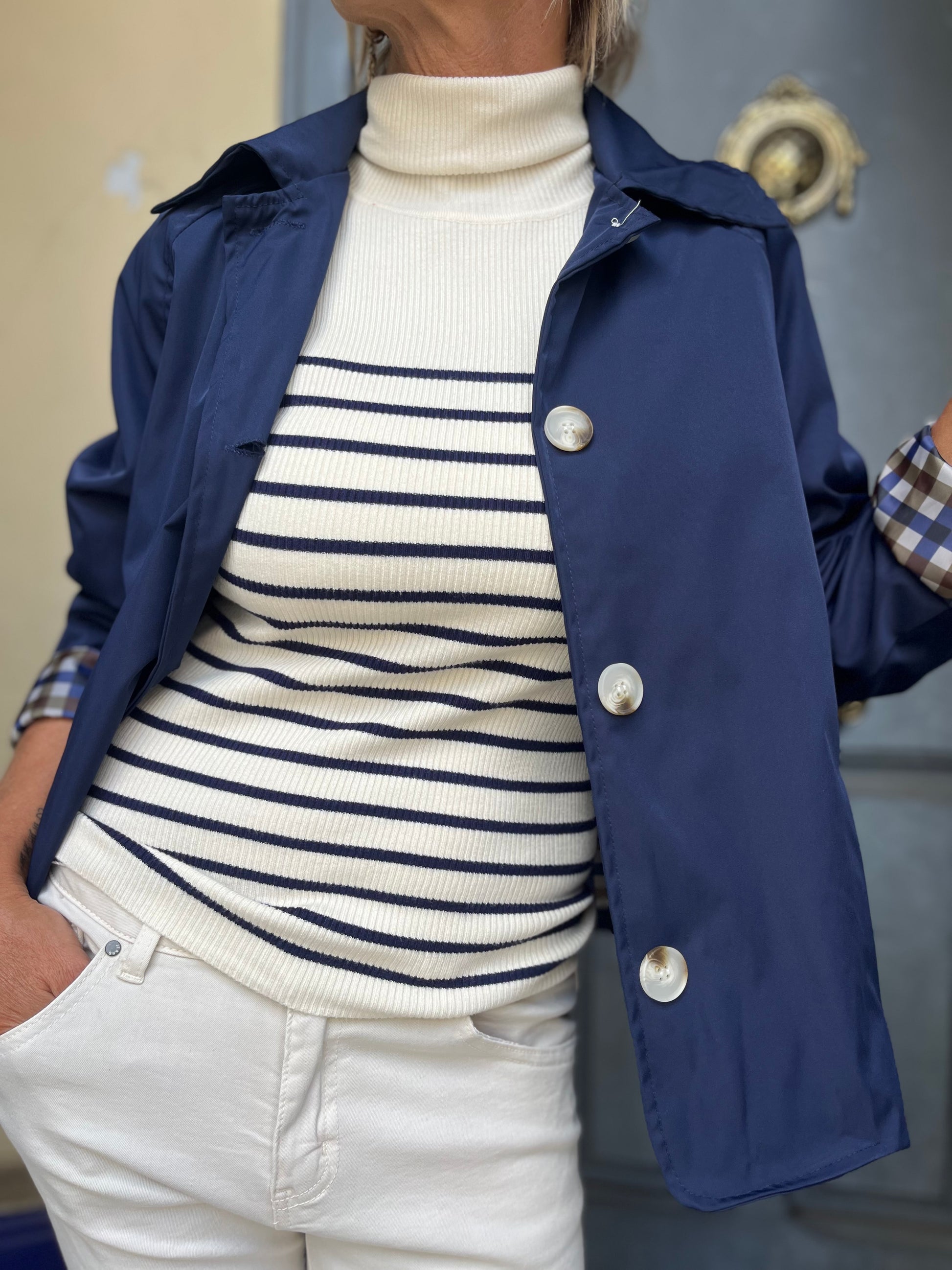 Gabardina corta a cadera, cuello camisera y bolsillos laterales. forro de quadros en camel, crudo y marino