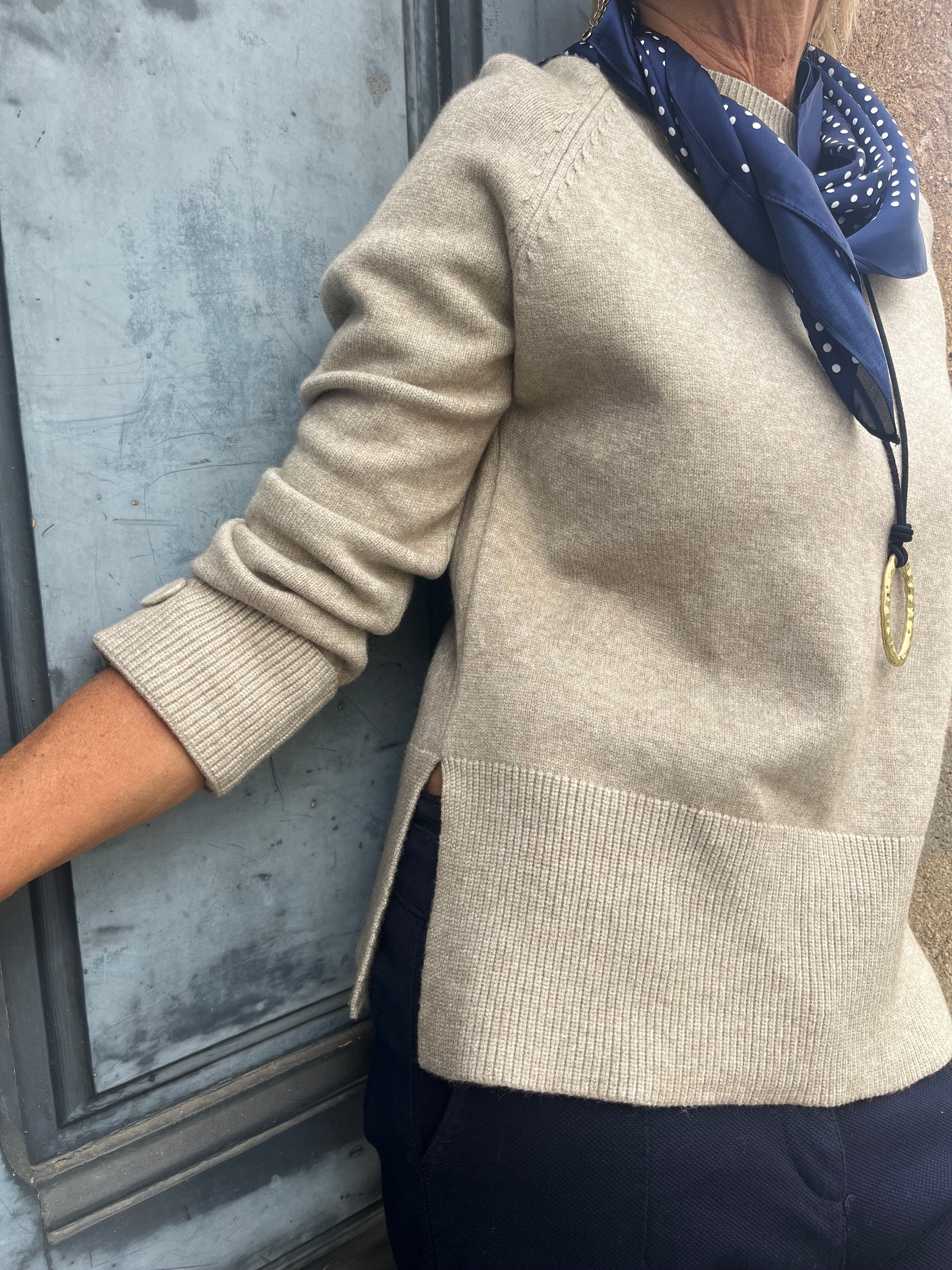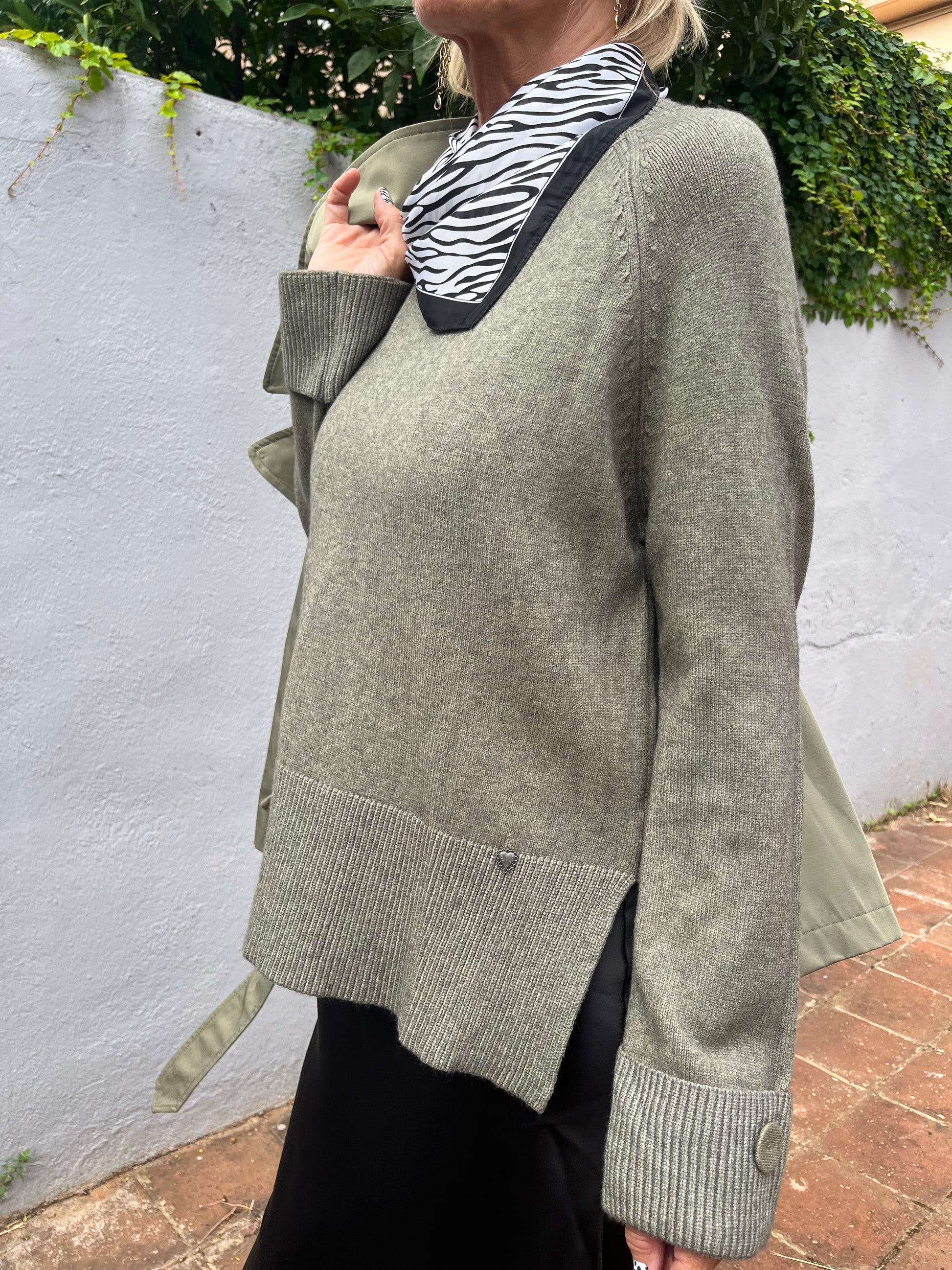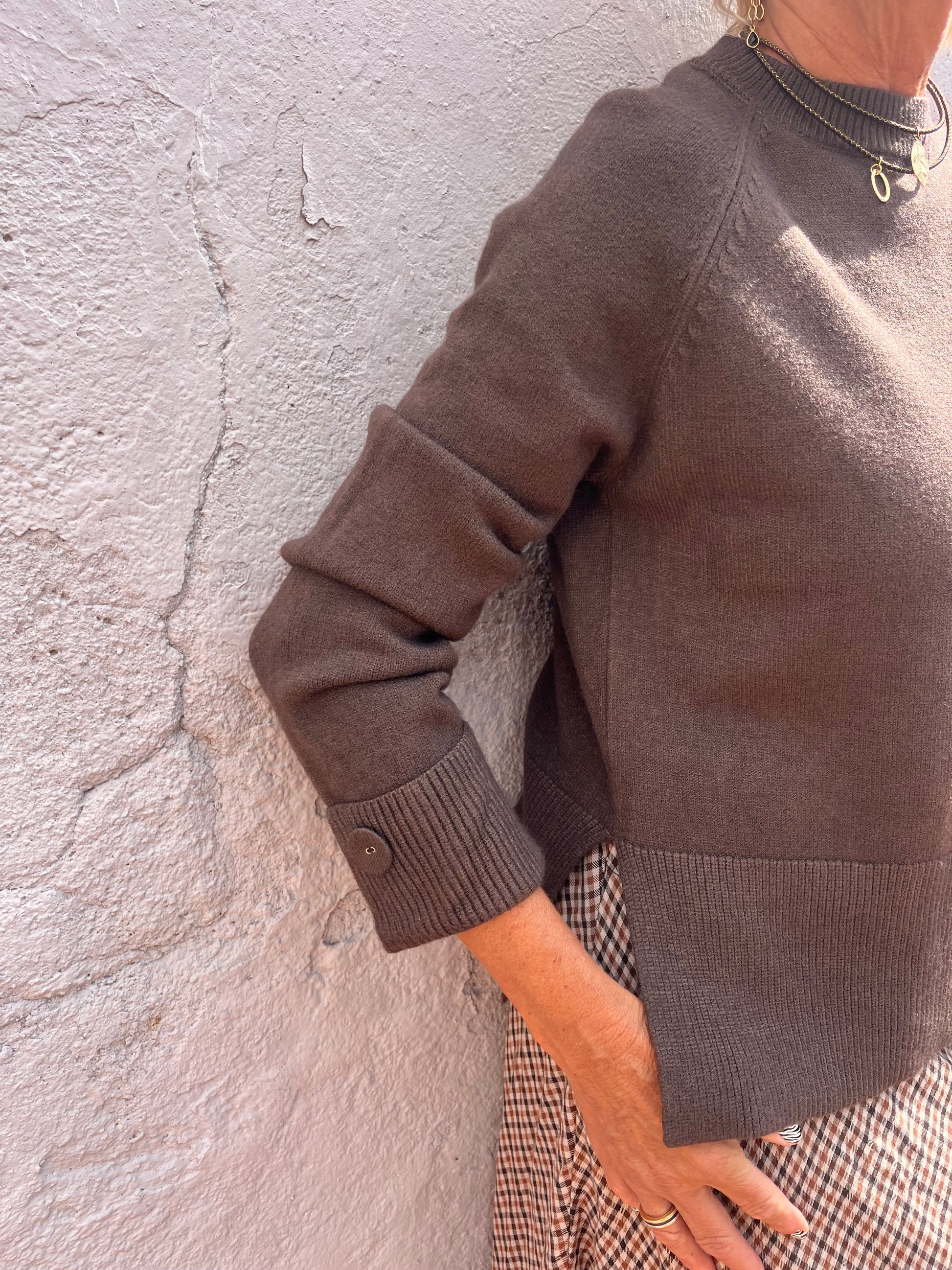 Jersei con tacto super agradable, recto, aperturas laterales en el ancho canalé y detalle del botón en puño