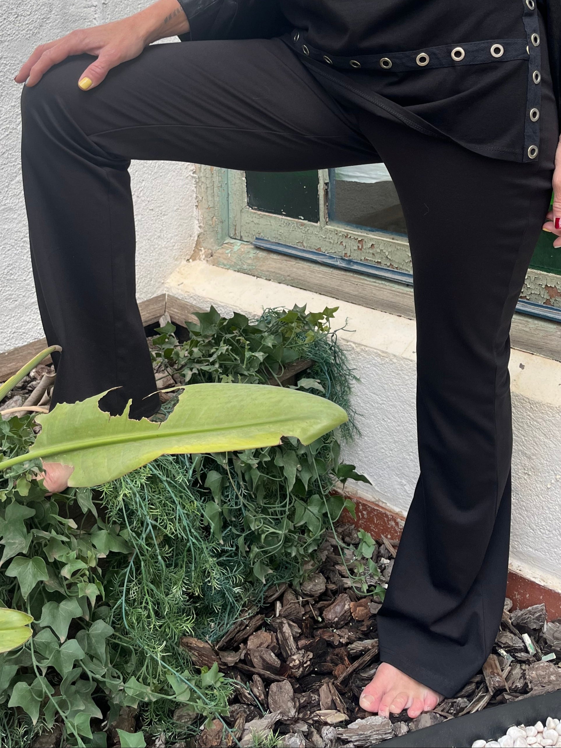 Pantalon campana con goma en la cintura, sin bolsillos, tipo malla pero acampanado en el tobillo.