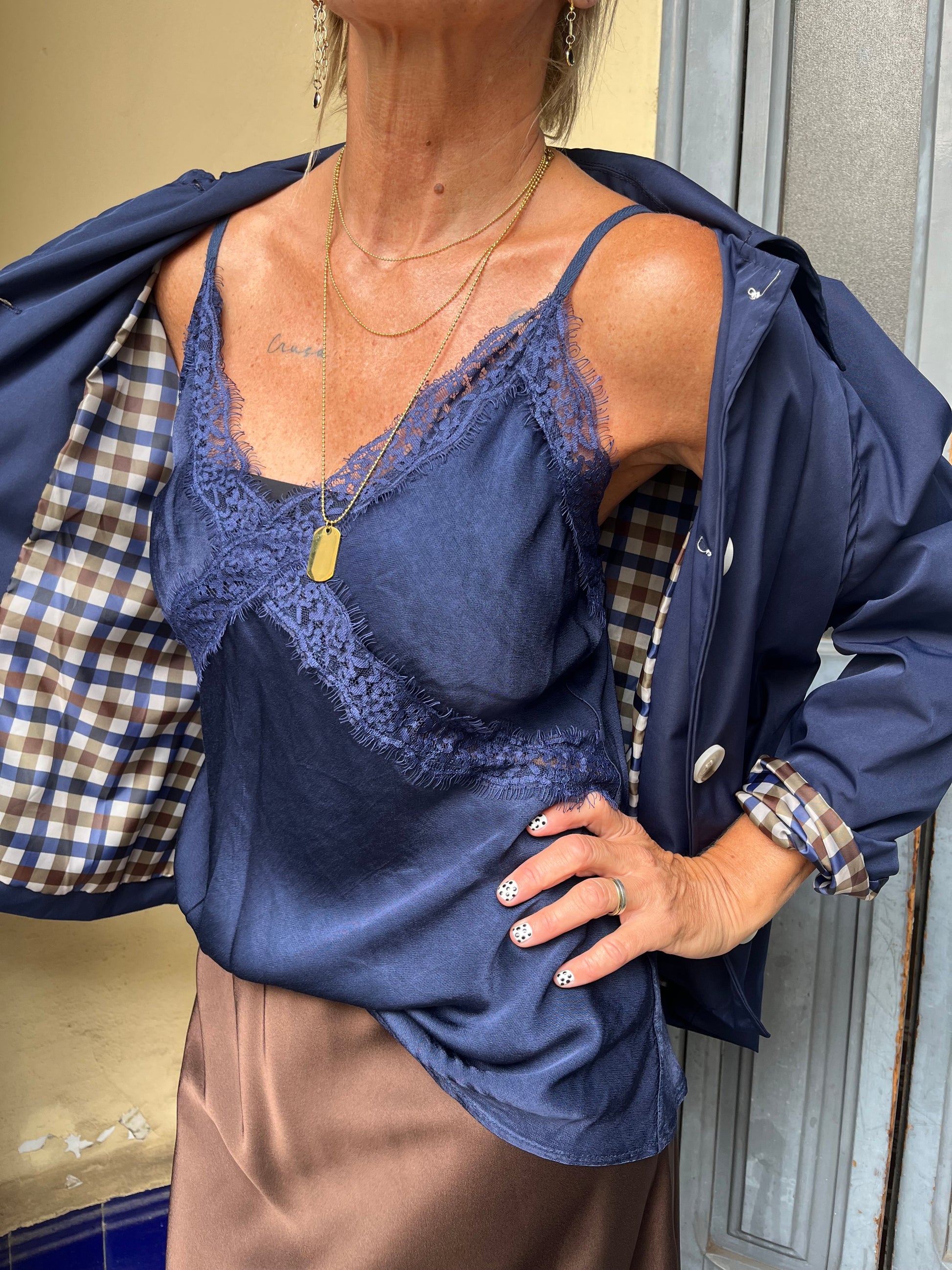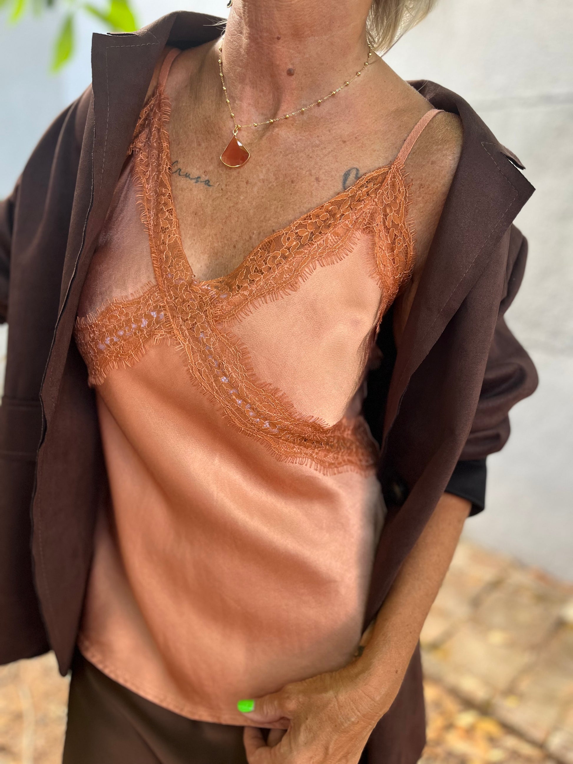 Top lencero de satén, tirantes regulables y puntillas cruzadas en la parte delantera, haciendo una bonita forma de pecho