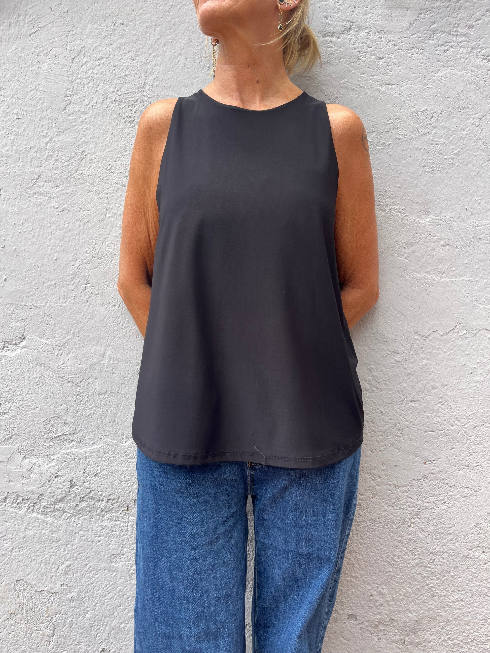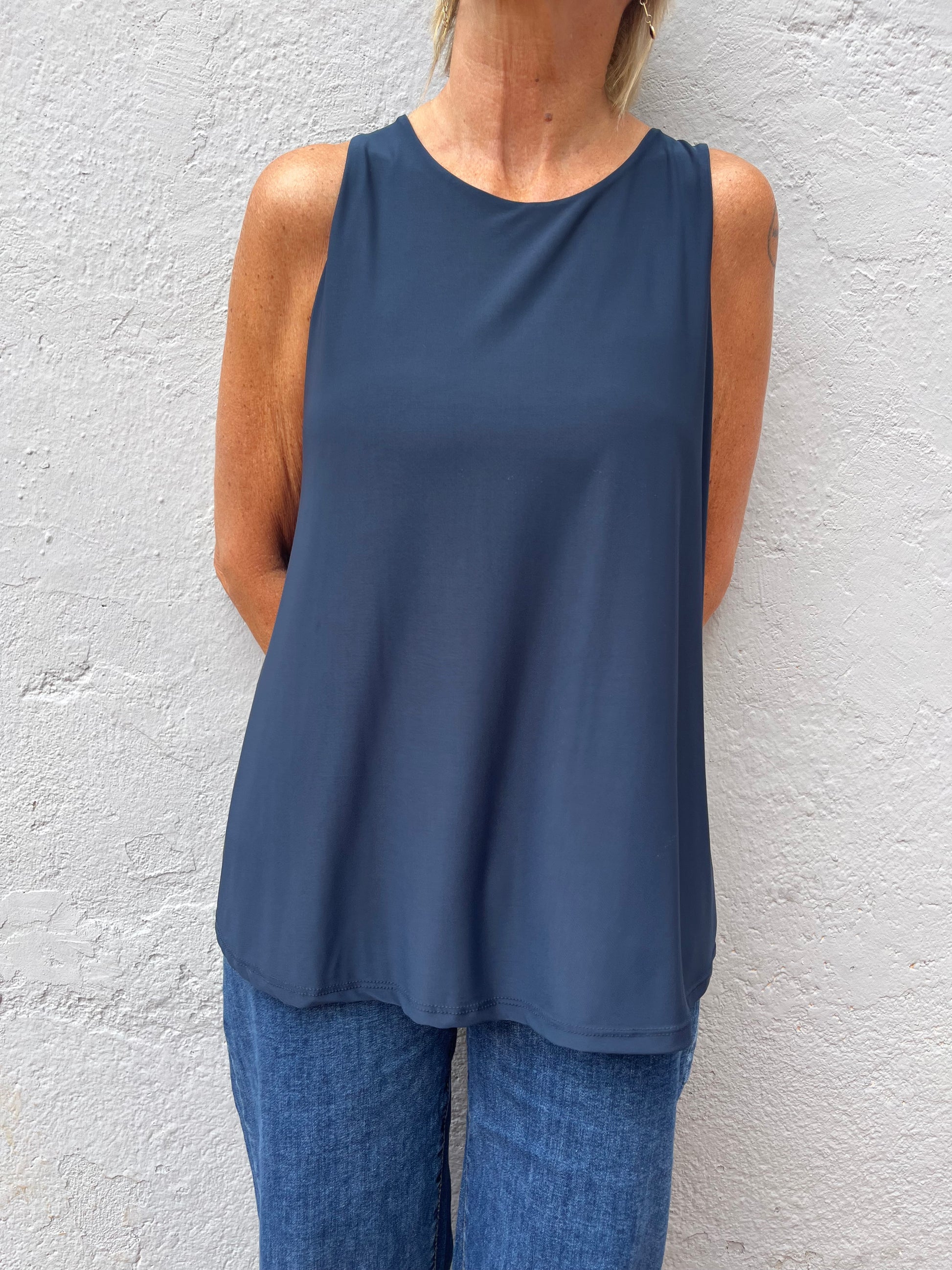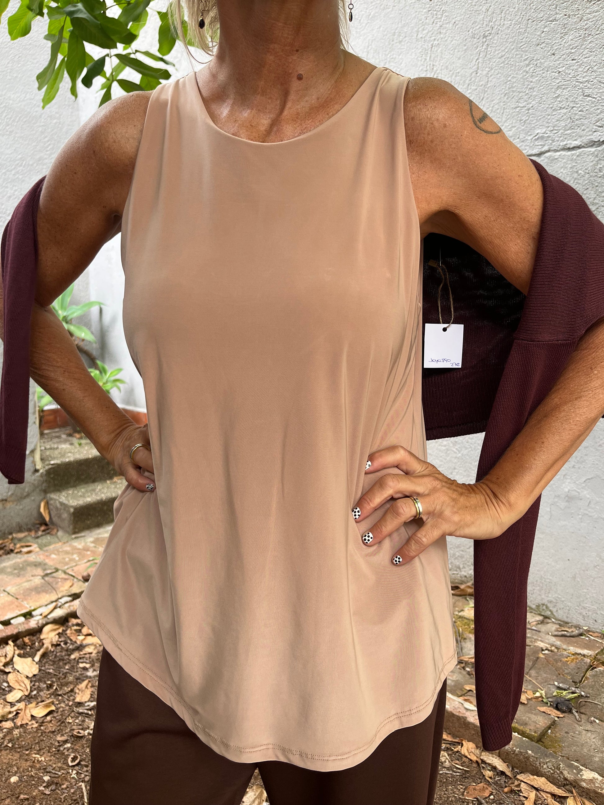 Top de tejido modal, con mucha caida, tirante ancho y evasé por debajo de cadera